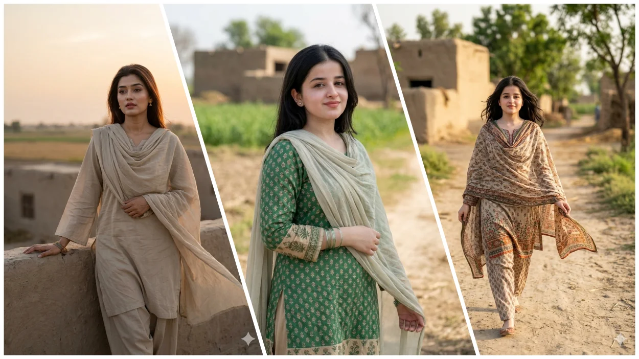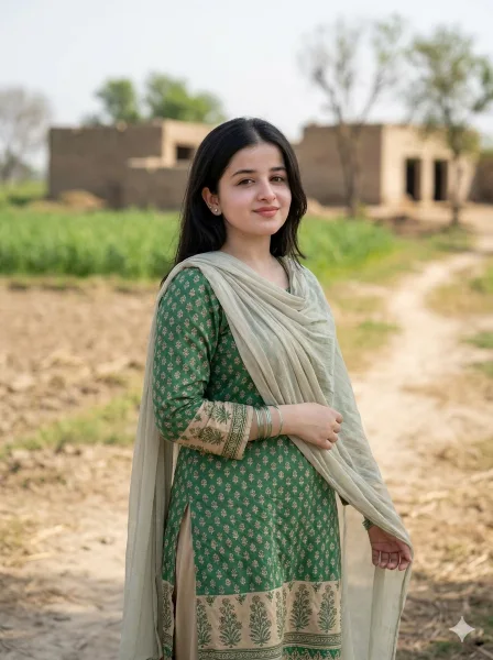 Use the attached reference image as the only face reference with strict identity lock. Keep the face 100% identical — no reshaping, no beautification, no distortion, no AI alteration. Preserve exact facial features, proportions, skin tone, head tilt, camera angle, pores, and natural expression. If face mismatch occurs, reject and regenerate. Create an ultra-realistic 8K cinematic full-body portrait of the same woman as a simple Pakistani village girl in an authentic rural setting, captured with natural realism and minimal styling. Full-body 3:4 vertical eye-level shot, subject centered or slightly off-center, face razor sharp and the most detailed element. She stands in a quiet village environment with relaxed posture, body slightly angled toward camera, one hand lightly holding her dupatta, calm natural expression with a soft composed smile. Outfit: simple traditional shalwar kameez with minimal patterns and a light dupatta, realistic fabric folds and natural drape. Hair open and naturally flowing, skin ultra-realistic with visible pores and soft highlights. Very minimal jewelry only, such as small earrings or simple bangles. Background includes open land, greenery, mud paths, plants, and rural village textures softly blurred with depth of field. Soft natural daylight, balanced shadows, HDR, earthy green-beige-soft brown cinematic color grading. Shot like real cinematic documentary photography with 50mm or 85mm lens, shallow depth of field, premium natural storytelling look. Must look like a real photograph. –ar 3:4 –no anime, cartoon, CGI, plastic skin, over smooth skin, distortion, low resolution