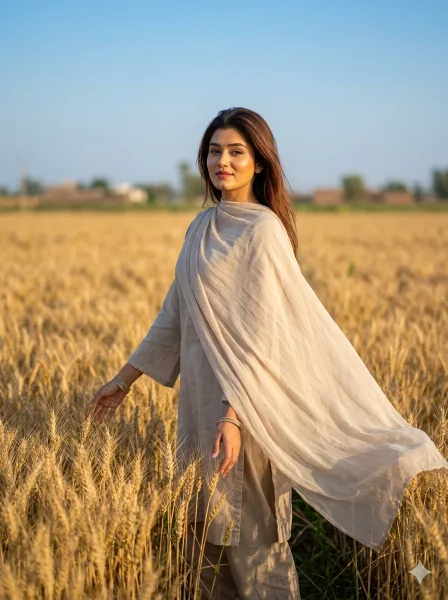 Use the attached reference image as the only face reference with strict identity lock. Keep the face 100% identical — no reshaping, no beautification, no distortion, no AI alteration. Preserve exact facial features, proportions, skin tone, head tilt, camera angle, pores, and natural expression. If face mismatch occurs, reject and regenerate. Create an ultra-realistic 8K cinematic full-body portrait of the same woman as a simple Pakistani village girl standing in a wide golden wheat field, captured with natural wind and cinematic rural storytelling. Full-body 3:4 vertical shot, slightly low angle, subject slightly off-center, face razor sharp and the most detailed element. She stands mid-field, slightly turned sideways, one hand gently brushing through the wheat plants, the other loosely holding her dupatta. Soft peaceful smile, calm grounded expression, looking slightly toward camera. Outfit: loose Pakistani lawn shalwar kameez with wide sleeves and a long flowing dupatta, lightweight fabric moving naturally in the breeze. Hair open and flowing softly in the wind, skin ultra-realistic with visible pores, natural tone, and warm sunlit glow. Minimal jewelry only, such as small studs or thin bangles. Background includes a vast wheat field, open sky, and distant rural horizon softly blurred with depth of field. Golden hour sunlight, soft rim light around hair, gentle shadows, HDR, warm golden yellow-beige-soft green cinematic color grading. Shot like real cinematic rural documentary photography with 85mm lens, shallow depth of field, premium natural storytelling look. Must look like a real photograph. –ar 3:4 –no anime, cartoon, CGI, plastic skin, over smooth skin, distortion, low resolution
