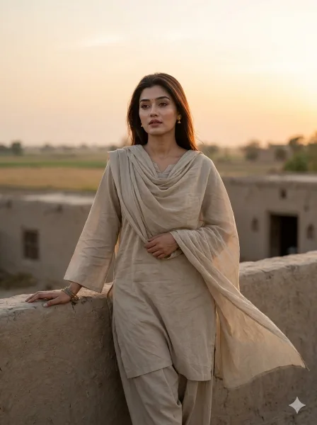 Use the attached reference image as the only face reference with strict identity lock. Keep the face 100% identical — no reshaping, no beautification, no distortion, no AI alteration. Preserve exact facial features, proportions, skin tone, head tilt, camera angle, pores, and natural expression. If face mismatch occurs, reject and regenerate. Create an ultra-realistic 8K cinematic full-body portrait of the same woman as a simple Pakistani village girl standing on a traditional rural rooftop at sunset, captured with calm cinematic atmosphere and natural realism. Full-body 3:4 vertical shot, eye-level or slight low angle, subject centered or slightly off-center, face razor sharp and the most detailed element. She stands near the rooftop edge, slightly leaning on a low wall, one hand resting casually while the other adjusts her dupatta. Calm thoughtful expression with a soft neutral look, gazing slightly away from camera. Outfit: loose Pakistani cotton shalwar kameez with wide sleeves and a long naturally draped dupatta, soft realistic fabric folds. Hair open with gentle breeze movement, skin ultra-realistic with visible pores, natural tone, and warm sunset glow. Minimal jewelry only, such as small earrings and thin bangles. Background includes mud or brick rooftop textures, open sky, distant fields, and soft rural village details blurred with depth of field. Warm sunset lighting, soft rim light around hair, golden highlights on face, smooth shadows, HDR, warm orange-beige-soft brown cinematic color grading. Shot like real cinematic rural lifestyle photography with 50mm or 85mm lens, shallow depth of field, emotional realism, premium natural storytelling look. Must look like a real human photograph. –ar 3:4 –no anime, cartoon, CGI, plastic skin, blur, distortion, low quality