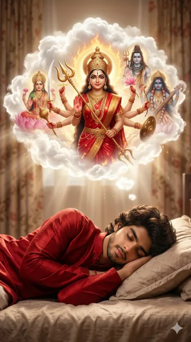 - Spiritual Dream Scene – A spiritual dream scene where the girl or girl is sleeping and she is having a dream of Maa Durga.