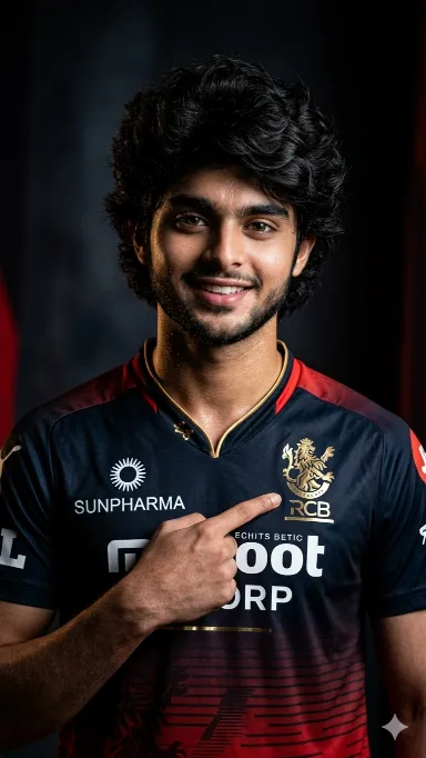 “A high-quality, cinematic studio portrait of Indian cricketer. He is wearing the Royal Challengers Bangalore (RCB) IPL jersey, which features a deep red and black gradient with gold accents and sponsorlogos like ‘SUNPHARMA’, He has a well-groomed beard and is pointing his index finger toward the RCB team crest on his chest.the lighting is dramatic low-key style, with a dark, moody background that makes the subject pop. High resolution, sharp focus on facial features and tattoos, professional sports photography style.and 100% my face matching