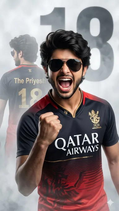 A realistic 3D illusion of a young Indian boy wearing black sunglasses and a Royal Challengers Bangalore (RCB) cricket jersey with “QATAR AIRWAYS” printed on the front. He is shouting in excitement with his mouth open and fist clenched in a victory pose. Behind him, there is a faded, ghostly image of the same boy standing with his back turned, showing the name “The Priyesh” and number “18” on the jersey. The background is a white and grey smoky atmosphere with a large faded number 18. Cinematic lighting, ultra-detailed, 8K resolution, photorealistic, sharp focus, dram shadows.IMPORTANT: Face must remain exactly the