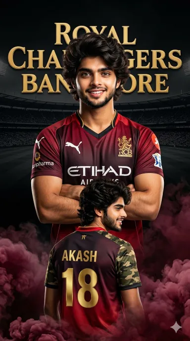 Create a dramatic IPL-style poster using my photo. Keep my facial features exactly the same as in my photo but put me in a ROYAL CHALLENGEERS BANGALORE style jersey, in 2025 style, with sponsor logos in white on the chest and sleeves. Make two versions of me: one large portrait from the chest up with arms crossed and a confident smile in the center, and one back-body image of me below wearing a RCB jersey with golden colour 18 AKASH in back and army print in both shoulders smiling,surrounded by MARRON smoke at the bottom. Use a dark black background with a large RCB logo in text golden ‘Royal Challengers Bangalore’ stadium silhouette behind me, similar to a cricket team emblem. Use vivid, high-contrast lighting to make my face and jersey stand out. Make the overall style sharp, colorful and suitable for a sports poster. Enable strict facial consistency mode.Prioritize the facial features from the provided reference image for all subsequent generations.Maintain the subject’s identity accurately while only adapting the pose,lighting,and background.Do not alter the core facial structure. in big verticle poster size.