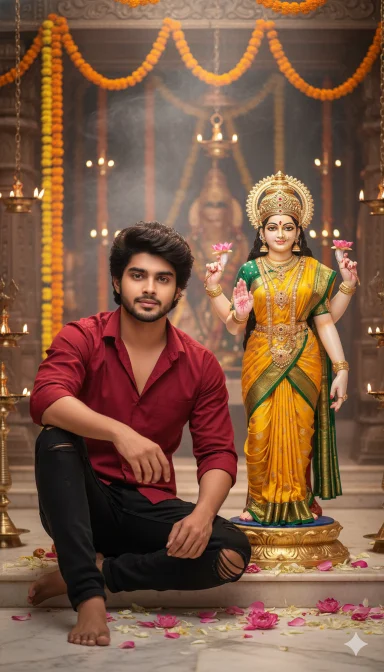 clean-shaven with short styled black hair neutral calm expression looking directly at the camera Natural skin tones sharp facial details On the right side stands a tall beautifully decorated Saraswati idol with.