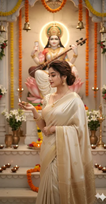 IMPORTANT – FACE LOCK Use the uploaded reference image as the ONLY face source. Do NOT change facial structure, jawline, eyes, nose, lips, skin tone, hairline, or expression. No beautification, no AI face regeneration, no smoothing. Natural pores, texture, and asymmetry must remain visible. The woman must be instantly recognizable as the same person. ASPECT RATIO 3:4 vertical Create an ultra-photorealistic 8K cinematic Saraswati Puja portrait inside a grand white marble temple. Behind her stands a large Goddess Saraswati idol seated on a pure white lotus, holding a veena and sacred book, wearing a white saree with gold borders, golden crown, and glowing ornaments. The mandir is decorated with marigold garlands, white lilies, glowing diyas, incense smoke, and hanging brass bells. OUTFIT The woman wears a soft ivory and gold silk saree with delicate embroidery, matching gold bangles, traditional jhumka earrings, and a simple gold necklace. Her hair is styled in a low bun with loose front strands. POSE She is standing gracefully, one hand gently holding a brass diya, the other hand slightly raised in blessing or devotion, head slightly tilted toward the idol, eyes calm and peaceful. LIGHTING Warm diya glow, soft temple light, golden highlights on her face and saree, divine glow around Saraswati Maa, realistic shadows and cinematic depth. MOOD Pure, spiritual, divine, festive Saraswati Puja atmosphere. CAMERA DSLR cinematic portrait, mid-to-full body framing, shallow depth of field, ultra-sharp focus on face.