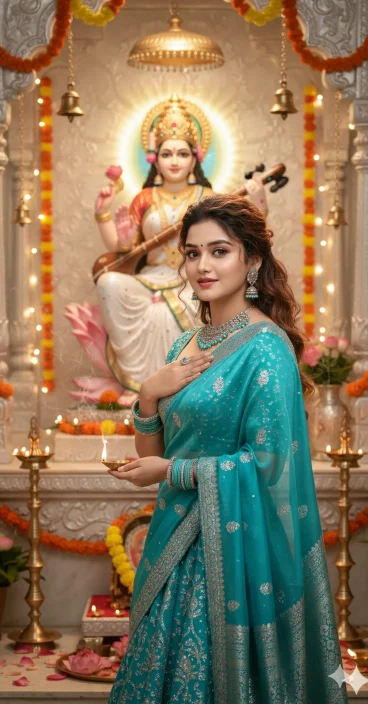 IMPORTANT – FACE LOCK The face must stay 100% identical to the uploaded reference. No face change, no beauty filter, no AI modification. Keep natural pores, skin texture, expression, and facial structure. ASPECT RATIO 3:4 vertical Create an ultra-realistic 8K cinematic devotional portrait inside a beautiful home Saraswati Puja altar. A fully visible Goddess Saraswati idol sits on a white lotus pedestal, holding a veena and holy book, wearing a white and gold saree, crown, and glowing ornaments. The background is filled with string lights, flower garlands, oil lamps, incense smoke, and lotus decorations. SUBJECT The same young woman from the reference photo, face perfectly matched, crystal-clear HD detail, natural expression, and soft devotional glow. OUTFIT A turquoise-blue and silver lehenga with shimmering embroidery, matching bangles, necklace, and earrings. Hair styled in soft waves with gentle volume. POSE She is standing slightly sideways, one hand holding a small brass diya, the other hand placed near her heart, eyes looking softly toward the camera with devotion and grace. LIGHTING Warm golden diya and fairy-light glow, soft rim light around her hair and face, divine illumination around Saraswati Maa, cinematic depth and realistic shadows. BACKGROUND Silver-white mandir walls, hanging bells, flower garlands, glowing lamps, incense smoke drifting softly. STYLE Ultra-photorealistic, DSLR look, 8K clarity, natural colors, no cartoon, no anime, no blur.
