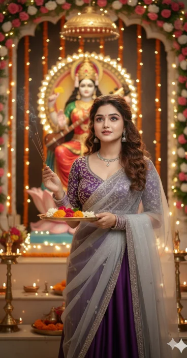 IMPORTANT – FACE LOCK The woman’s face must remain 100% identical to the uploaded reference. No AI beautification, no reshaping, no smoothing. Natural skin texture and real facial details must remain. ASPECT RATIO 3:4 vertical Create an ultra-realistic 8K Saraswati Puja scene inside a modern decorated pandal. A bright Saraswati idol stands on a white lotus platform, holding a veena and scripture, surrounded by LED fairy lights, floral arches, and glowing diyas. OUTFIT The woman wears a royal purple embroidered Anarkali suit with a silver dupatta, matching silver bangles, earrings, and a delicate necklace. Her hair is styled in soft curls flowing freely. POSE She stands in front of the idol, one hand holding a prayer plate with flowers and incense, the other hand slightly raised in offering, body facing forward, eyes gently looking toward the idol. LIGHTING Soft LED glow, warm diya light, cinematic highlights on her face and outfit, divine glow around Saraswati Maa. CAMERA DSLR vertical full-body shot, shallow depth of field, ultra-clear facial focus.