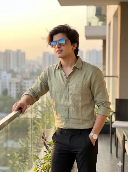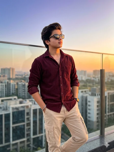 Ultra-realistic 8K iPhone 14 Pro style photo of a young Indian man standing at the corner of a modern rooftop terrace during golden hour sunset. FACE LOCK (100% same as reference, no changes, no beautification). Ultra-HD sharp face with natural skin texture and visible pores, face as the sharpest element.