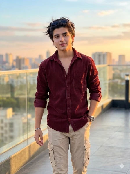 Outfit: maroon corduroy shirt (open collar, rolled sleeves), beige cargo pants, black sunglasses, minimal watch.
