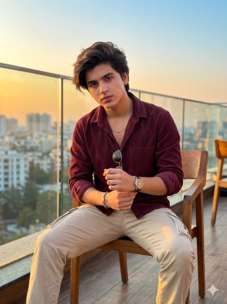 Ultra-realistic 8K iPhone 14 Pro style photo of a young Indian man sitting on a modern chair in a rooftop terrace during golden hour. FACE LOCK (100% same as reference, no changes, no beautification). Ultra-HD sharp face with natural skin texture and visible pores, face as the sharpest element.